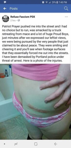 “Patriot Prayer pushed me into the street and I had no choice but to run, was smacked by a truck retreating from mace and a lot of huge Proud Boys, just minutes after we expressed our leftist views, we were being pursued by the very people that just claimed to be about peace. They were smiling and cheering it and you’ll see when the footage surfaces that they essentially force me out onto the streets. I have been demasked by Portland police under threat of arrest. Here is a photo of the injuries.”