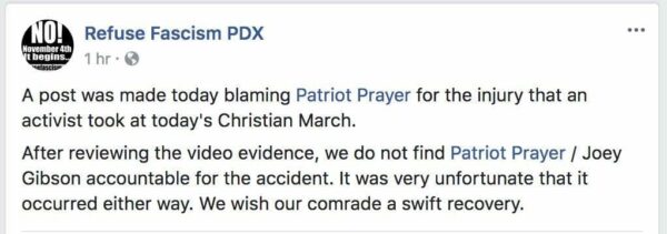 “A post was made today blaming Patriot Prayer for the injury that an activist took at today’s Christian March.