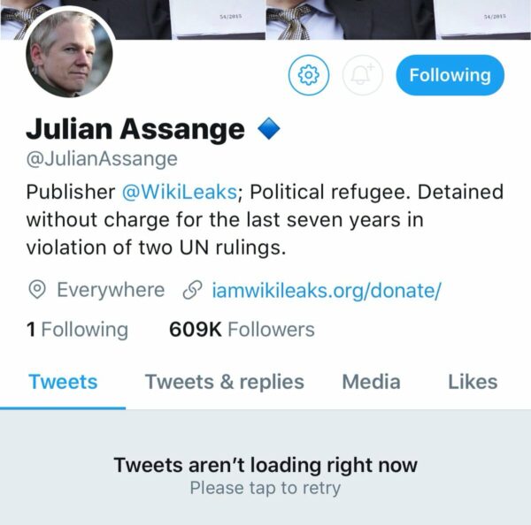 It is unclear whether he deactivated or if he was suspended, but given Twitter’s new pro-censorship rules, many are speculating that it is the latter. A source who works closely with WikiLeaks told the Gateway Pundit that they were not aware of any plans for Assange to deactivate his account on his own.