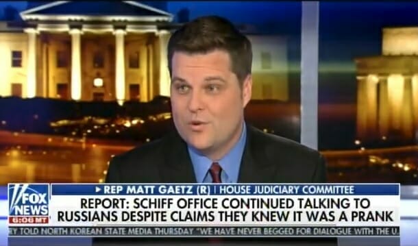 Rep. Matt Gaetz: Adam Schiff should step aside as the lead Democrat on the Intelligence Committee as a consequence of this scandal. While our FBI and Justice Department are suffering through an Obama nation, an Obama influence with these attempts to influence investigations. And yet you have Adam Schiff off playing footsie with the Ukrainians.