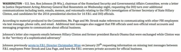 In the same letter, Senator Johnson asked Deputy Attorney General Rod Rosenstein to produce additional texts and emails from 16 FBI officials, including former FBI Director James Comey and Deputy Director Andrew McCabe.