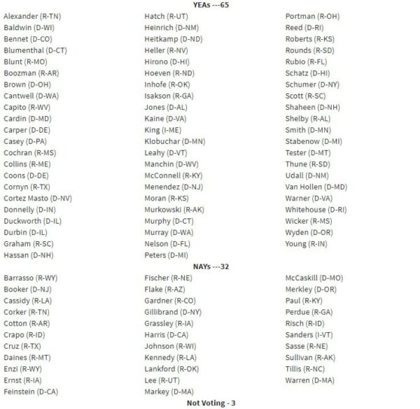 Of the 32 “against” votes, 23 were Republicans, including stalwart conservatives such as Republican Sens. Ted Cruz of Texas, James Lankford of Oklahoma, Cory Gardner of Colorado, Rand Paul of Kentucky,Tom Cotton of Arkansas and Mike Lee of Utah.
