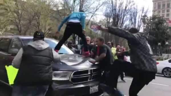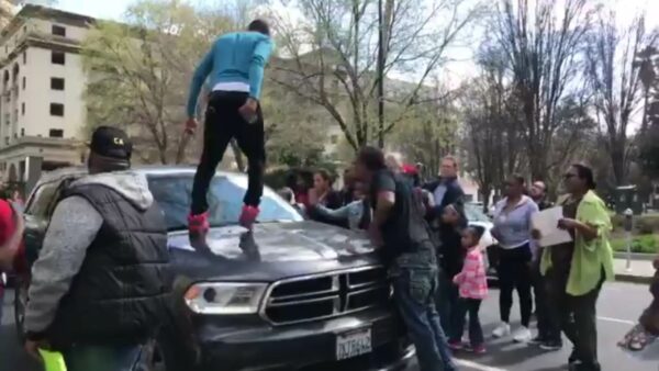 Black Lives Matter activists protesting the police shooting of Stephon Clark in Sacramento, California last weekend took to the streets of the city on Friday where they attempted to block traffic. Video taken by a local reporter shows the activists blocking and jumping on the hood of a SUV in traffic, then smashing the rear window on the vehicle as the driver speeds off to escape. The driver is not readily seen, but appears to be a woman as the protesters repeatedly called the driver, “Bitch!”