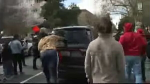 Screen images show protester smashing rear window of SUV, then walking away as the vehicle speeds off.