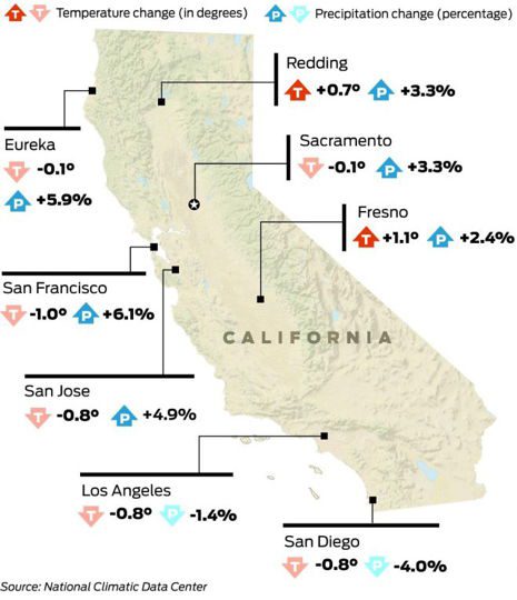 As reported in the San Francisco Chronicle today, a meteorologist did a 30-year survey of temperature and precipitation data for most of the largest cities up and down the state of California. Conclusion? In 75% of the sites, the weather has grown colder and rainier than it used to be.