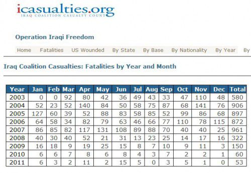 Thanks to the successful Bush Surge in 2007-2008, that Obama and democrats opposed, the number of US fatalities in Iraq has gone from over 100 a month down to a handful or less a month.