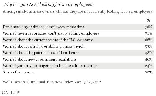 U.S. small-business owners who aren’t hiring — 85% of those surveyed — are most likely to say the reasons they are not doing so include not needing additional employees; worries about weak business conditions, including revenues; cash flow; and the overall U.S. economy. Additionally, nearly half of small-business owners point to potential healthcare costs (48% ) and government regulations (46% ) as reasons.