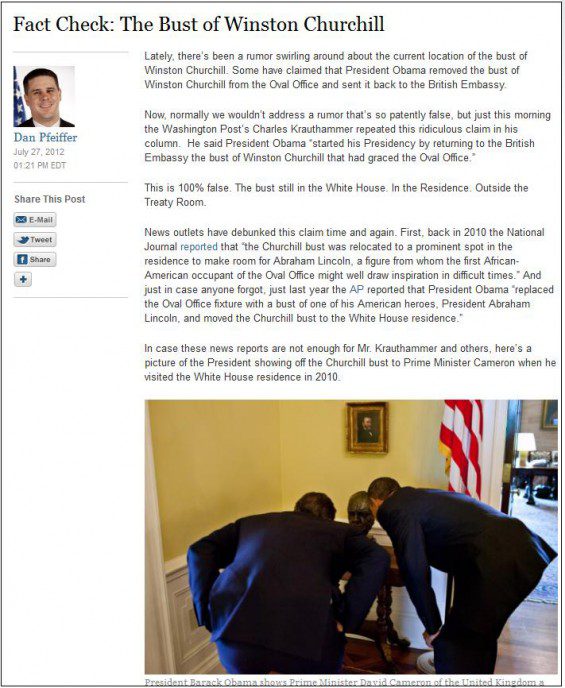 “Normally we wouldn’t address a rumor that’s so patently false, but just this morning the Washington Post’s Charles Krauthammer repeated this ridiculous claim in his column. He said President Obama “started his Presidency by returning to the British Embassy the bust of Winston Churchill that had graced the Oval Office.”