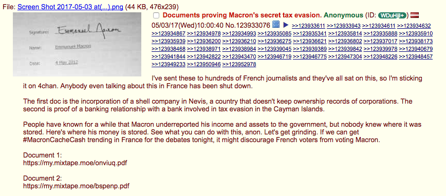 Two days ago, an Anon on /pol/ (the 4Chan thread notorious for unmasking Antifa, among other things) uploaded proof of Macron’s tax evasion.