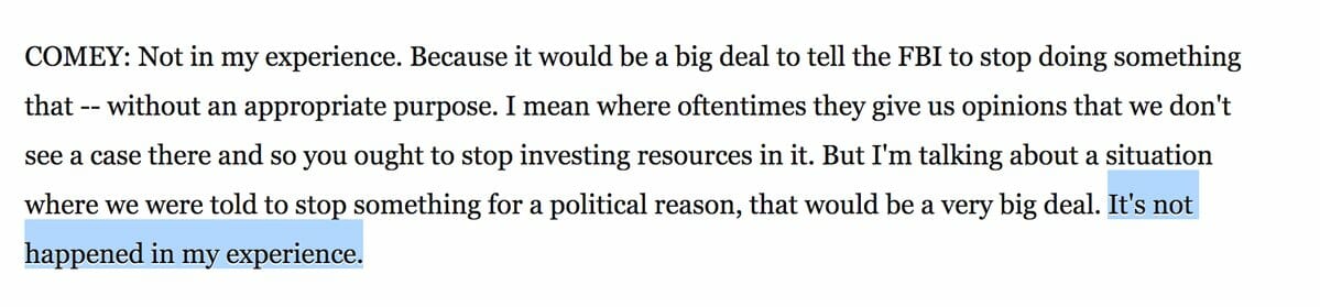 **Update**: Comey was asked more broadly if the DOJ had told him to halt investigations. Nevertheless, Comey admitted under oath that he wasn’t pressured to stop his investigation.