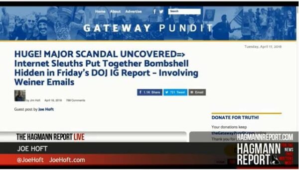 The Gatewaypundit’s Joe Hoft was on the Hagmann Report on Tuesday and provided an analysis of the DOJ IG’s report released last Friday and connections with the Weiner email scandal.