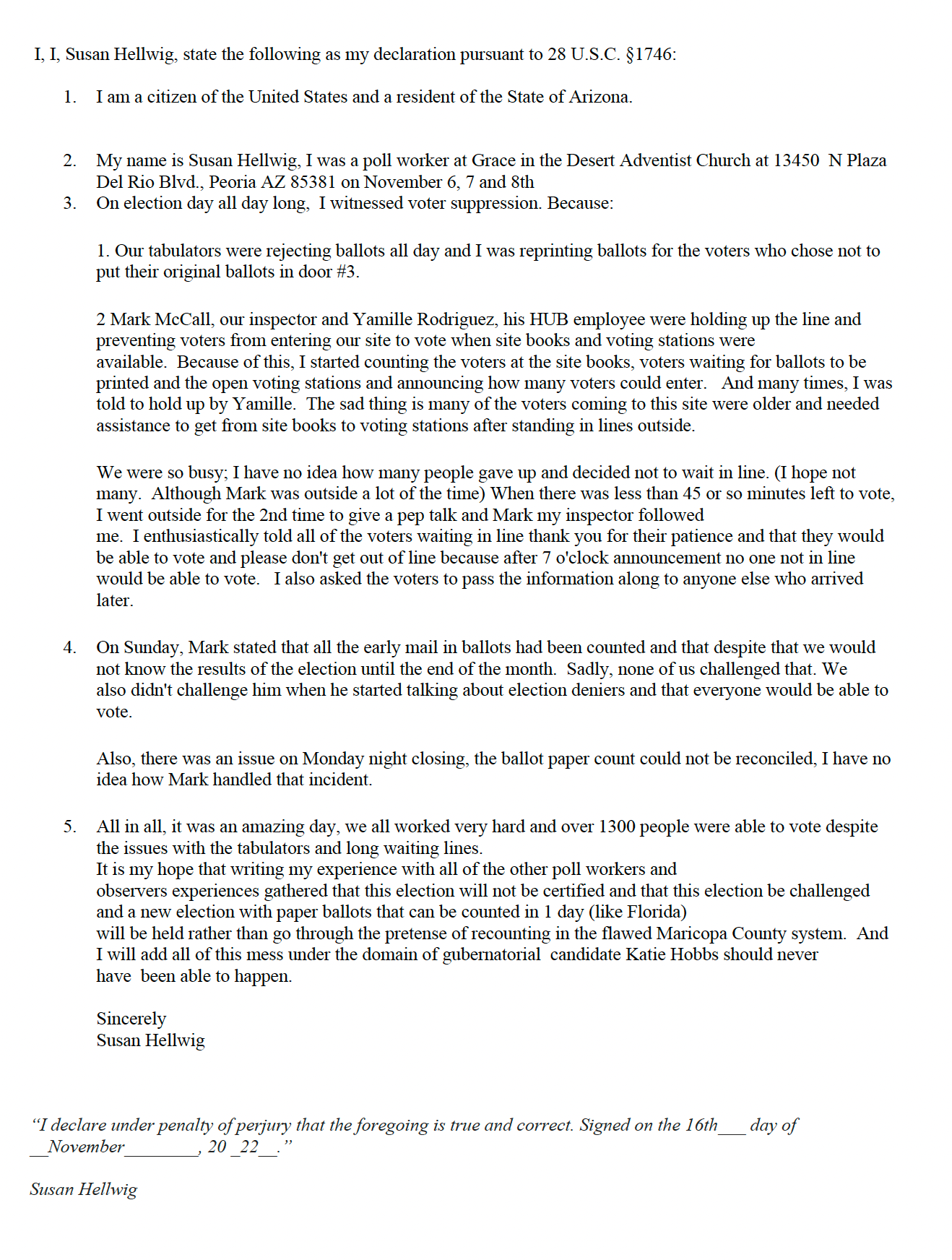 When we closed after the election, Mark was having us do certain tasks, breaking down booths, site books, sweeping, emptying trash, etc. Judges were assigned to the tabulators, Mark was doing paperwork. I knew it was our job to break down the equipment so I didn't think much about it. We were tired and wanted to finish up. One judge said she saw the totals and Kari Lake's team numbers were 500 for Lake to 100 for Hobbs. We got everything packed up and we left for the evening.